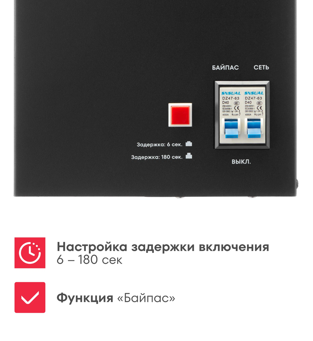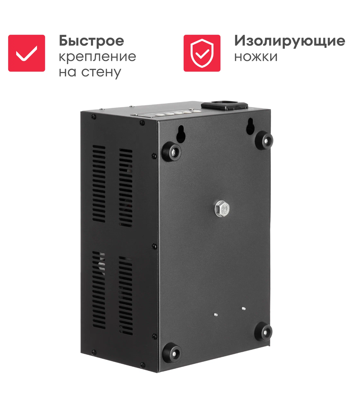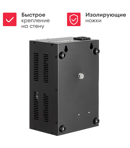 Дополнительная информация задержка запуска 6 - 180 сек, евро-розетка + клеммы, автоматический вентилятор охлаждения, диэлектрические ножки, напольная и настенная установка, быстросъемное крепление на стену, цветная индикация, отображение силы тока