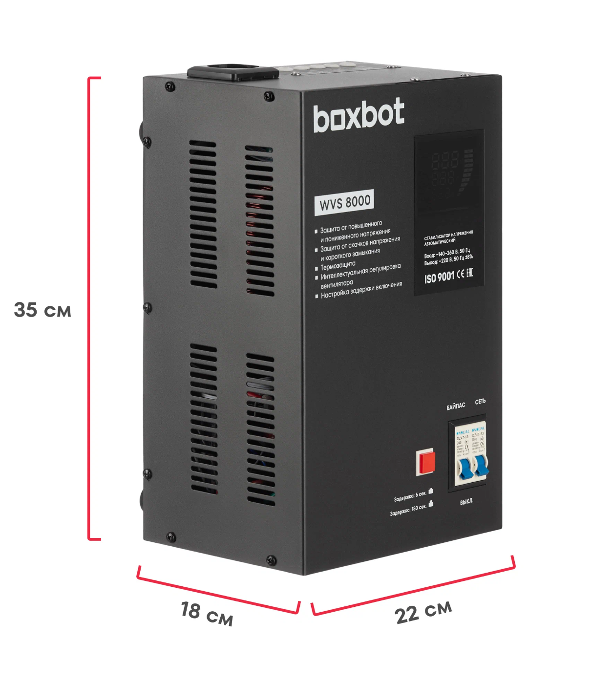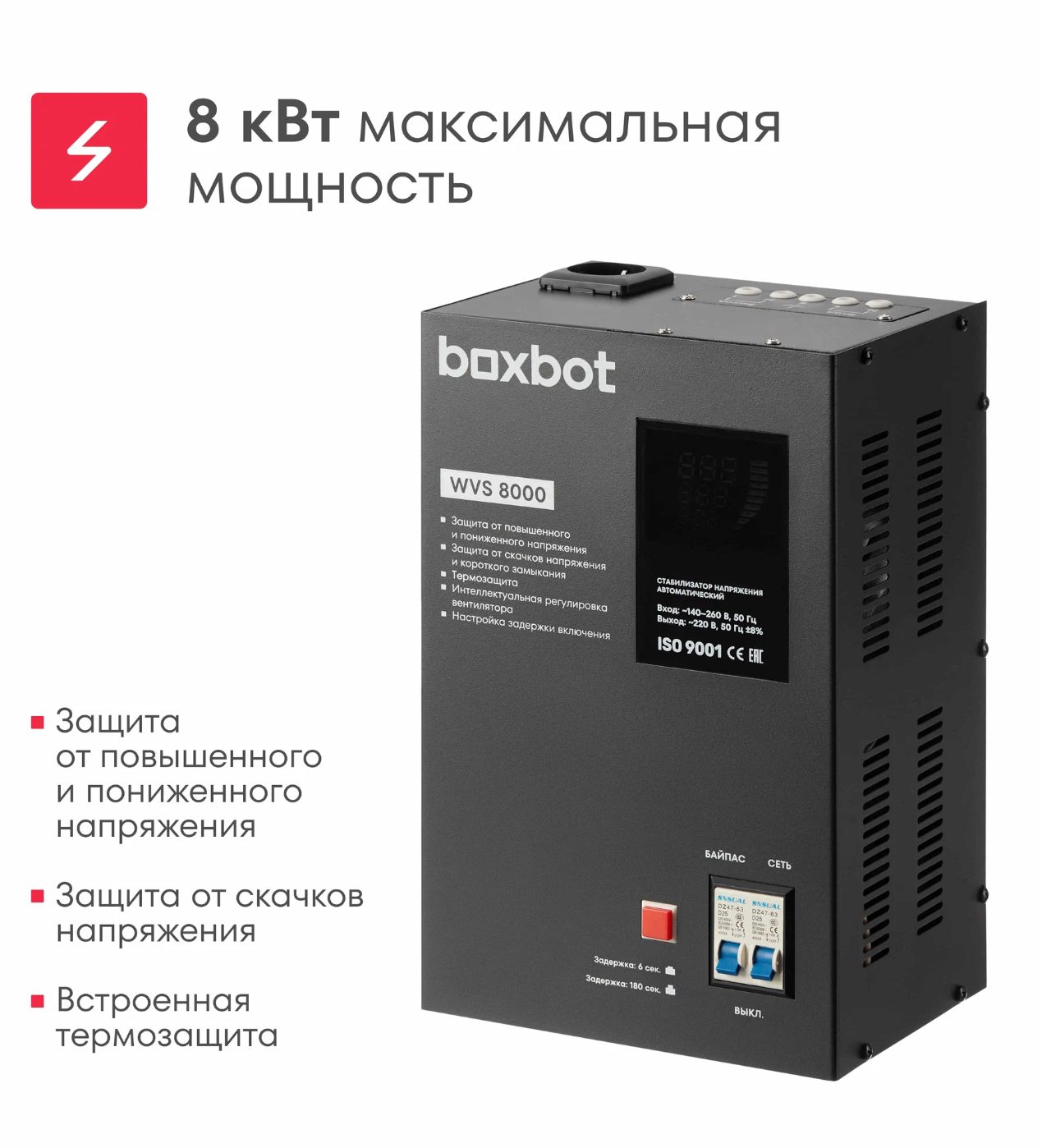 Стабилизатор напряжения автоматический Boxbot WVS 8000, 8 кВт, клеммник+розетка, настенный/напольный, LCD-дисплей, настройка задержки, байпас