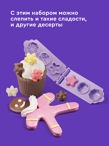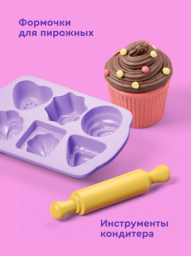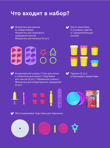 Комплектация 4 вида формочек, 6 цветов теста-пластилина, кондитерский шприц, стек и лопатка для лепки, маленькая скалка, подставки для кексов и многоуровневая подставка для пирожных, брошюра с пошаговыми инструкциями