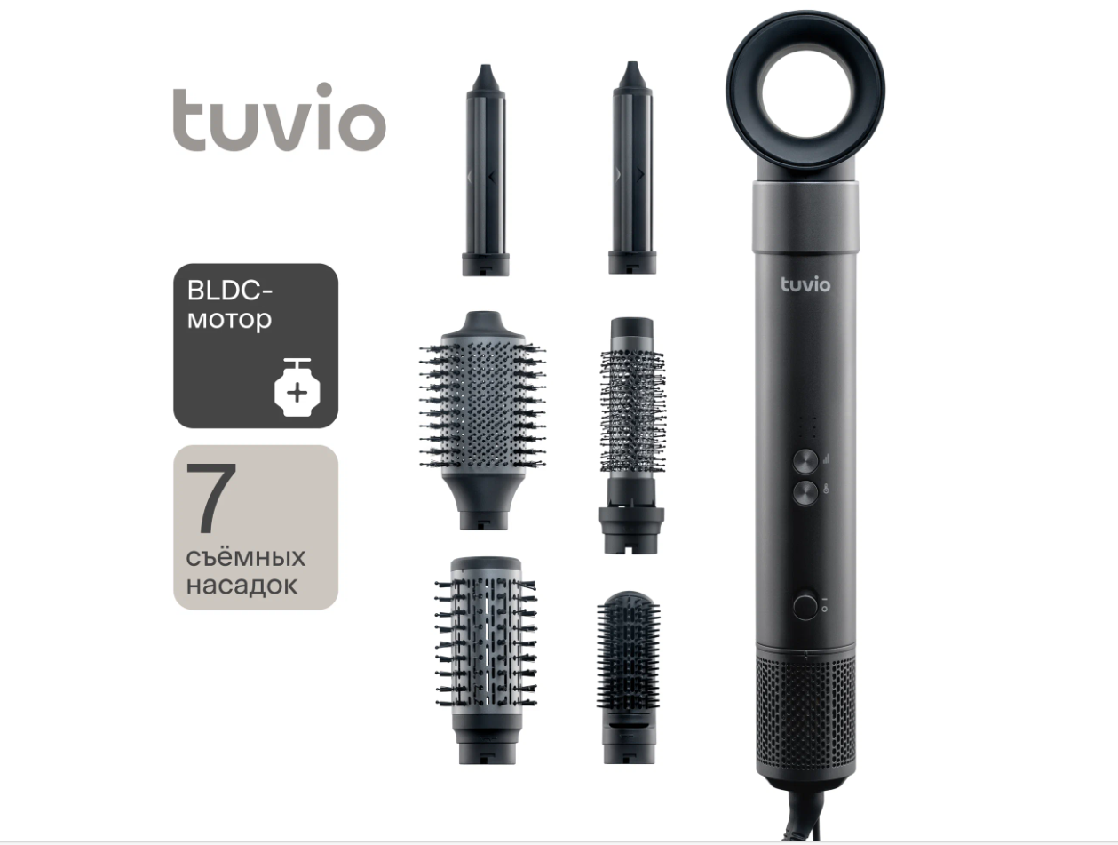 Фен-щётка с ионизацией Tuvio HBI1411, 7 насадок, тёмный металлик